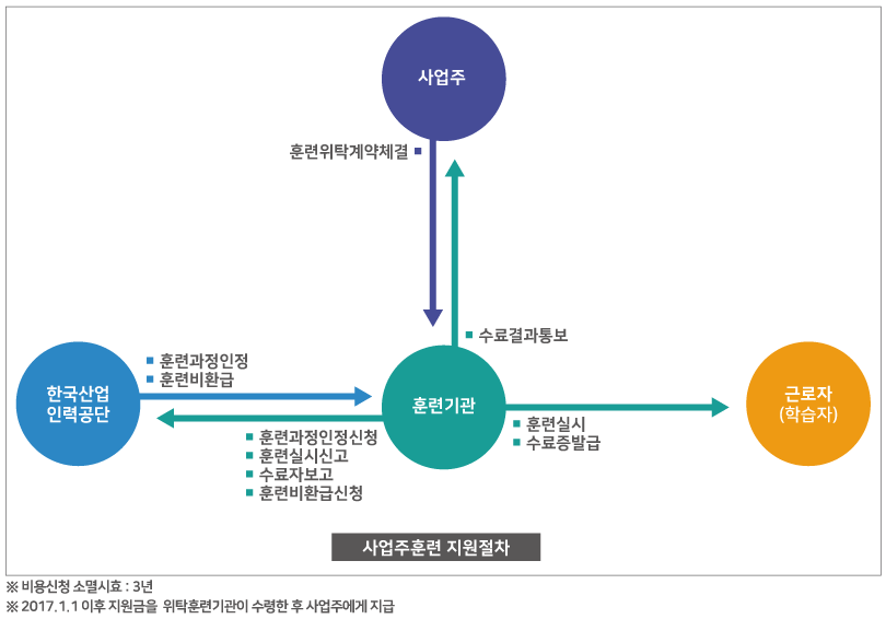 사업주가 소속근로자 등 직무수행능력을 향상시키기 위하여 직업능력개발훈련을 실시한 경우 이에 소요되는 비용의 일부를 고용노동부에서 지원해 주는 제도입니다.